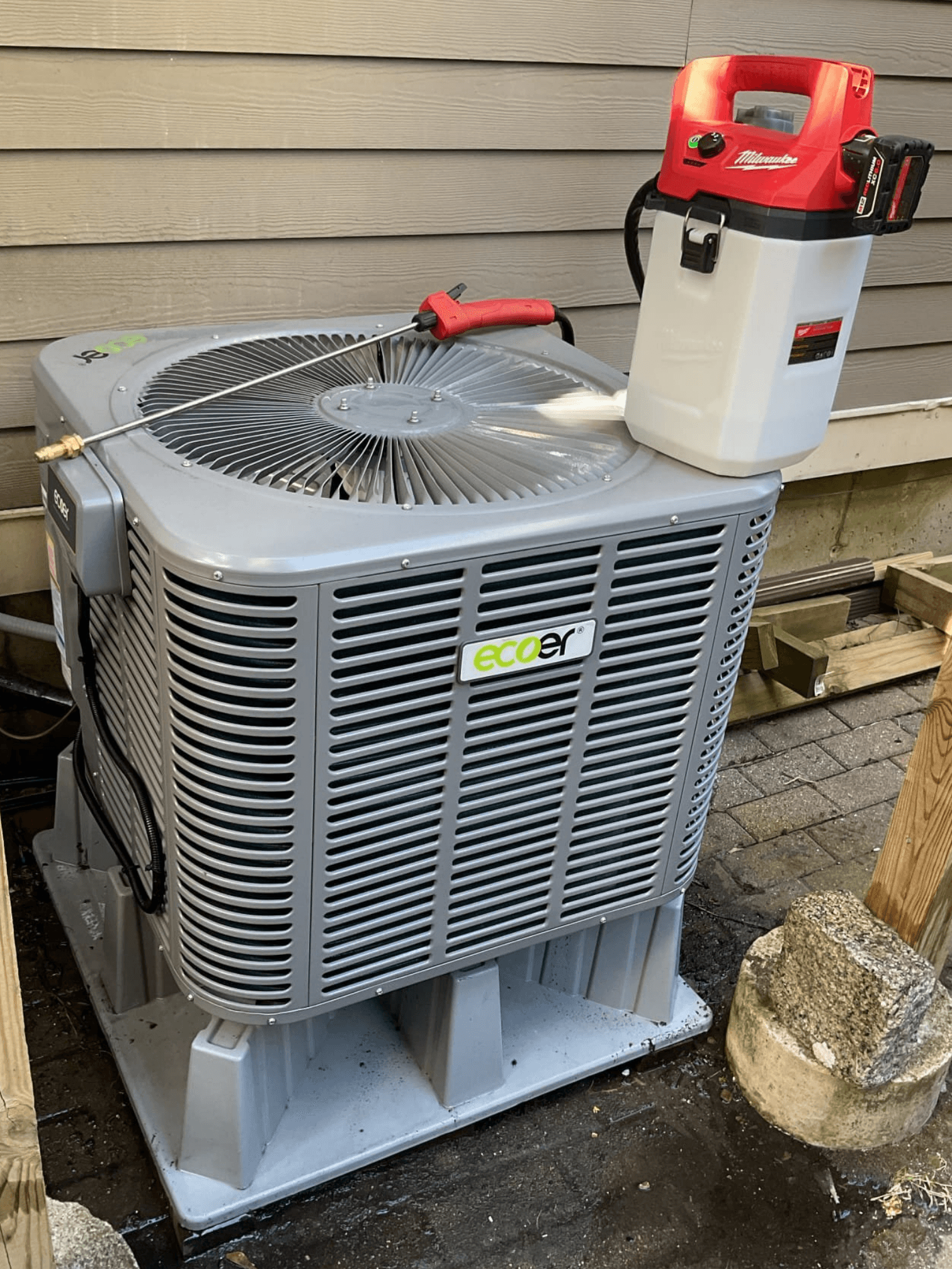 If bushes are pressing into the unit, cut them back so air can move freely.Rinse the exterior coil gently